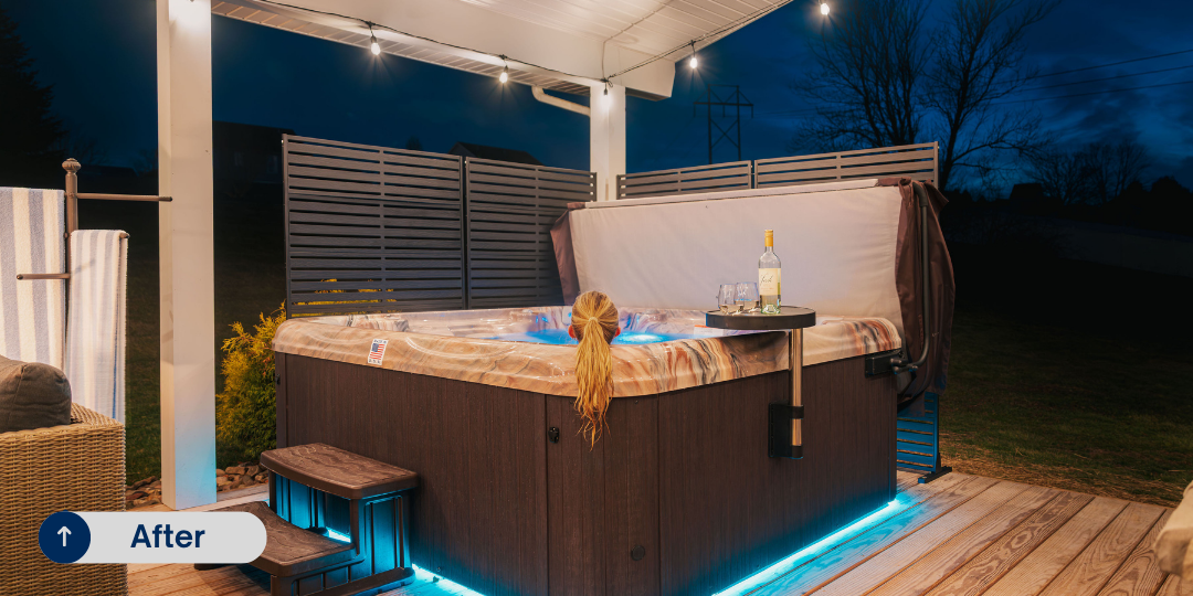 The space is anchored by a 6-person hot tub, thoughtfully tucked behind custom privacy fencing for a secluded, resort-style feel. To take it to the next level, we also installed a 65″ outdoor TV, allowing guests to catch the big game, playoffs, or prime-time matchups without ever leaving the hot tub.