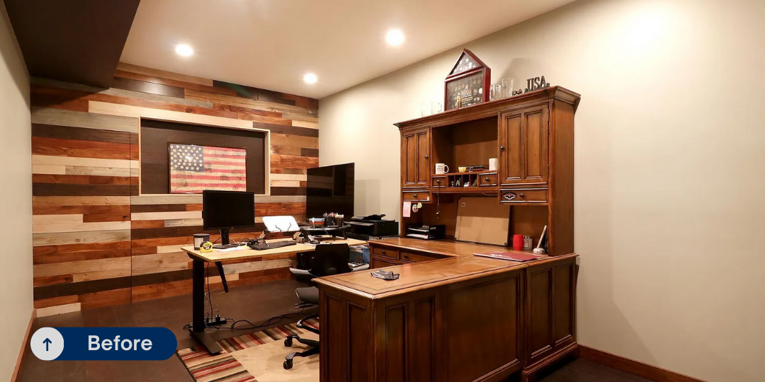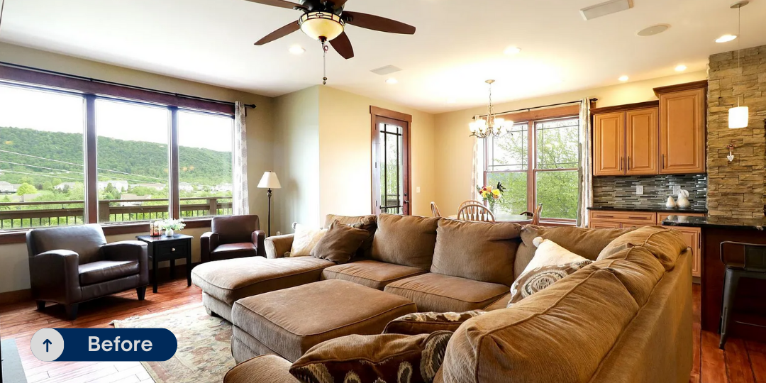 The living room was completely transformed from a dated, disconnected space into the true heart of the home. We replaced the generic sectional and conversation chairs with premium leather sofas offering seating for up to 10 guests, instantly creating a comfortable, social layout designed for large groups.