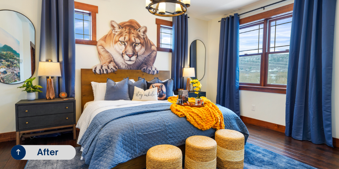 For the primary bedroom, we delivered a dramatic, head-turning transformation. The centerpiece is a massive Nittany Lion (mountain lion) wall mural, perfectly positioned above the king-sized bed—perched, intense, and looking like it’s ready to pounce. It’s bold, unexpected, and instantly unforgettable.